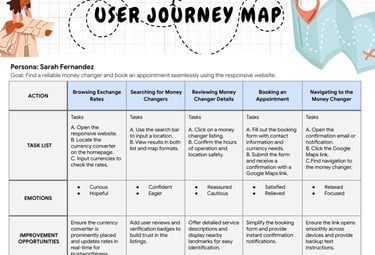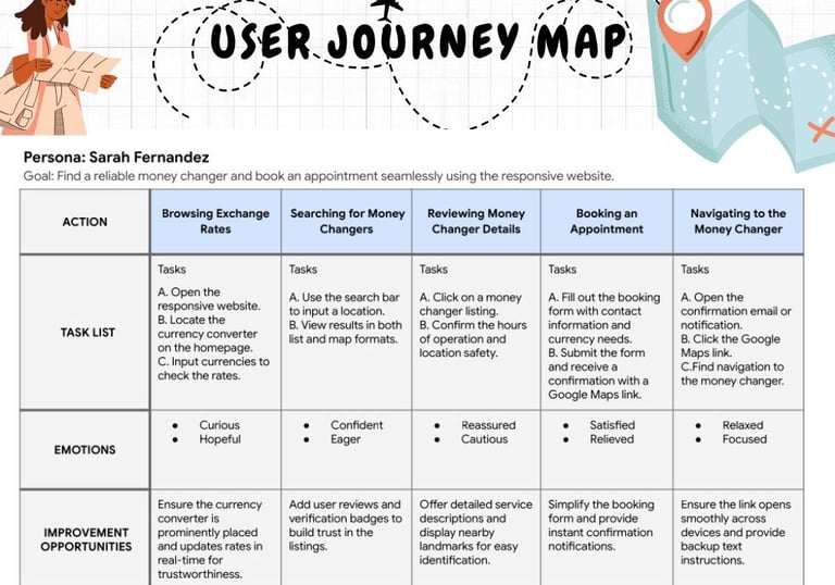 I created a user journey map 🗺️ to understand the steps travelers take when finding and booking money changers 💱.