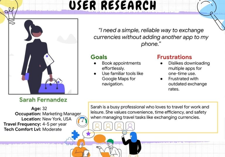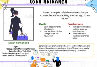 I conducted interviews with travelers 🛫, surveyed potential users 🌍, and performed a competitive audit 🔍 to understand challenges with currency exchanges, finding trusted money changers 💱, and booking appointments 📅, identifying gaps in existing solutions.