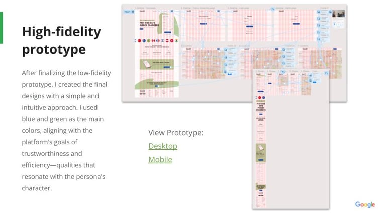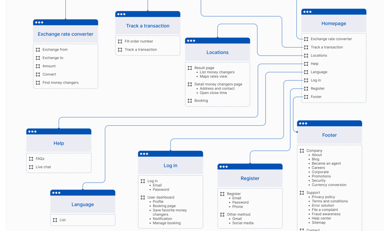 Based on ideation and Information Architecture, I sketched and created wireframes for key screens—real-time rate checker, money changer search, and booking confirmation. These designs were refined through user feedback 📝.